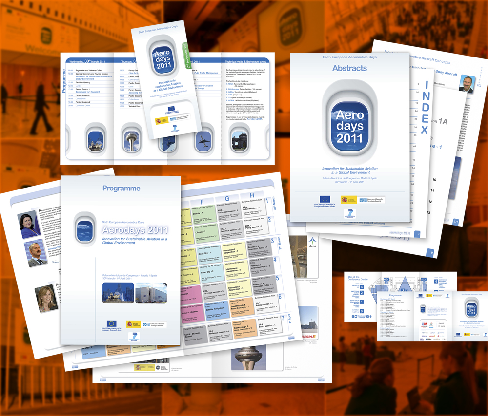 Aerodays es el principal congreso europeo de innovación en aeronáutica. En 2011, de la mano del CDTI, Drouso se encargó de la producción. Para mí, el proyecto fue un reto de volumen: Diseño de la imagen del congreso, aplicaciones online; materiales impresos, anuncios, programas, folletos, libro de abstracts; completa decoración y señalética del Palacio Municipal de Congresos de Madrid, dos auditorios y 25 salas (sesiones paralelas, salas de ponentes, reuniones privadas, prensa, oficina…)
